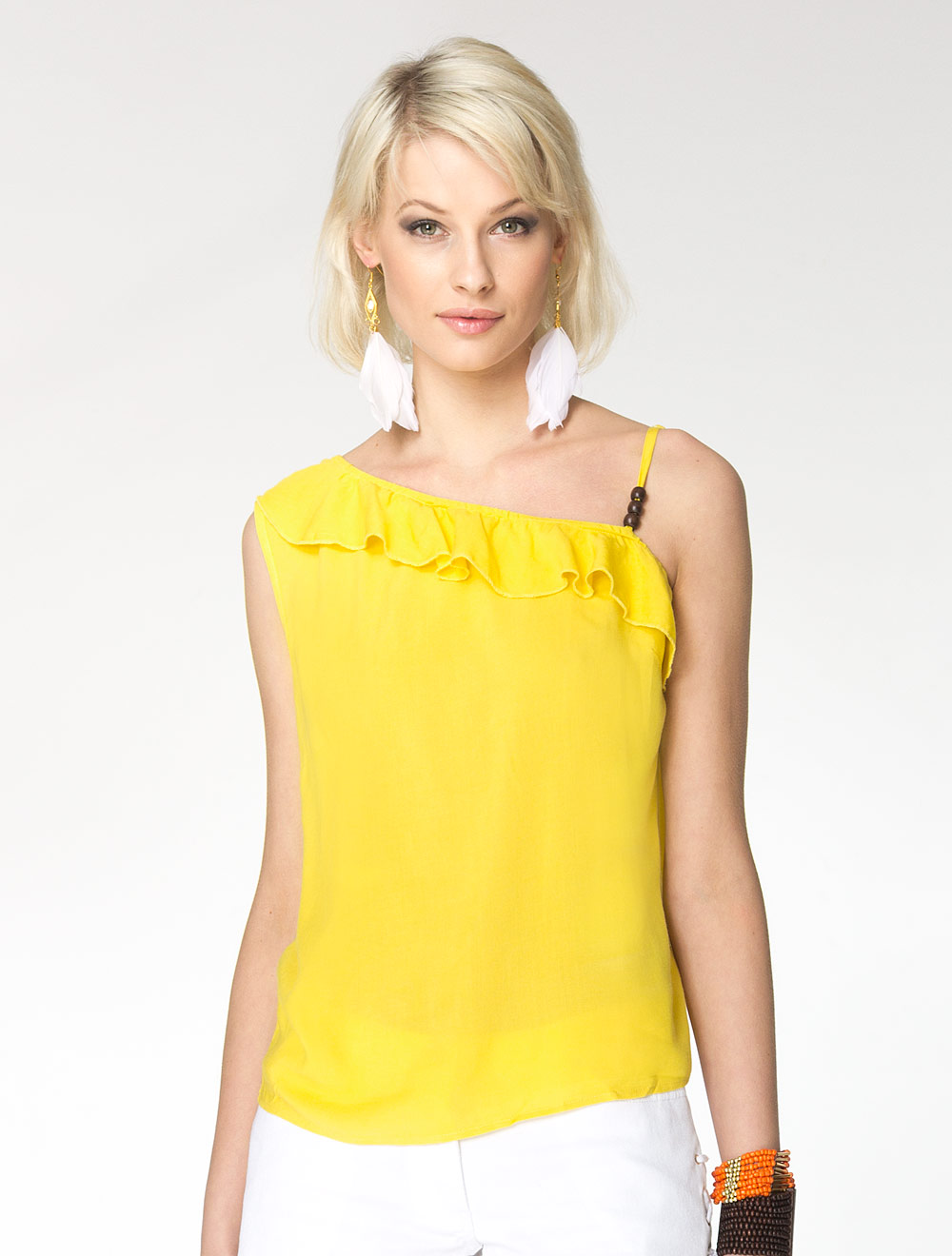 Описание: Вискозное полотно средней плотности. Асимметричная линия верхнего среза украшена воланом, а бретель - деревянными бусинами.