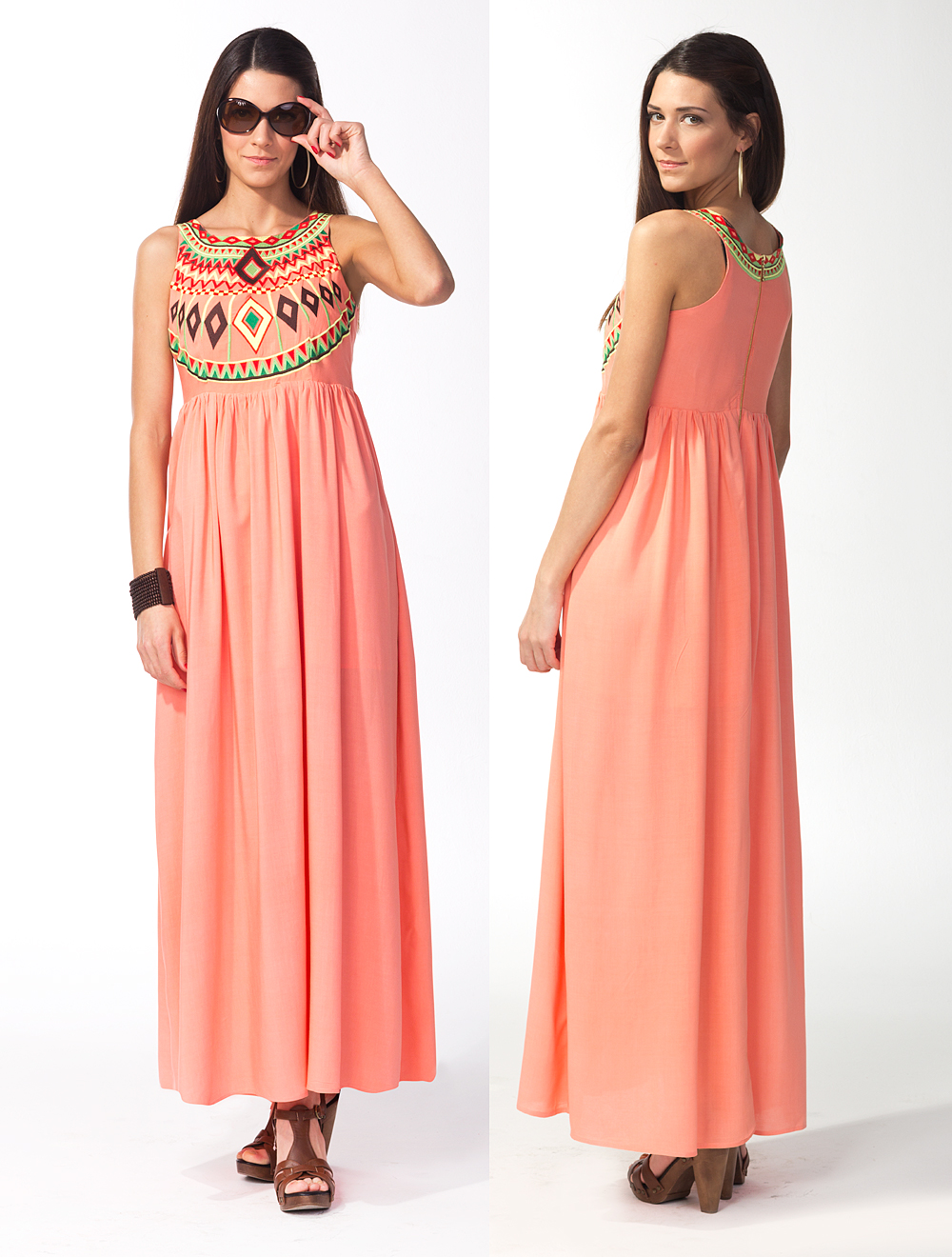 Описание: Передняя верхняя часть двуслойная, наружная деталь украшена пестрой этнической вышивкой. На спинке золотистая молния. Платье на тонкой укороченной подкладке из хлопка.