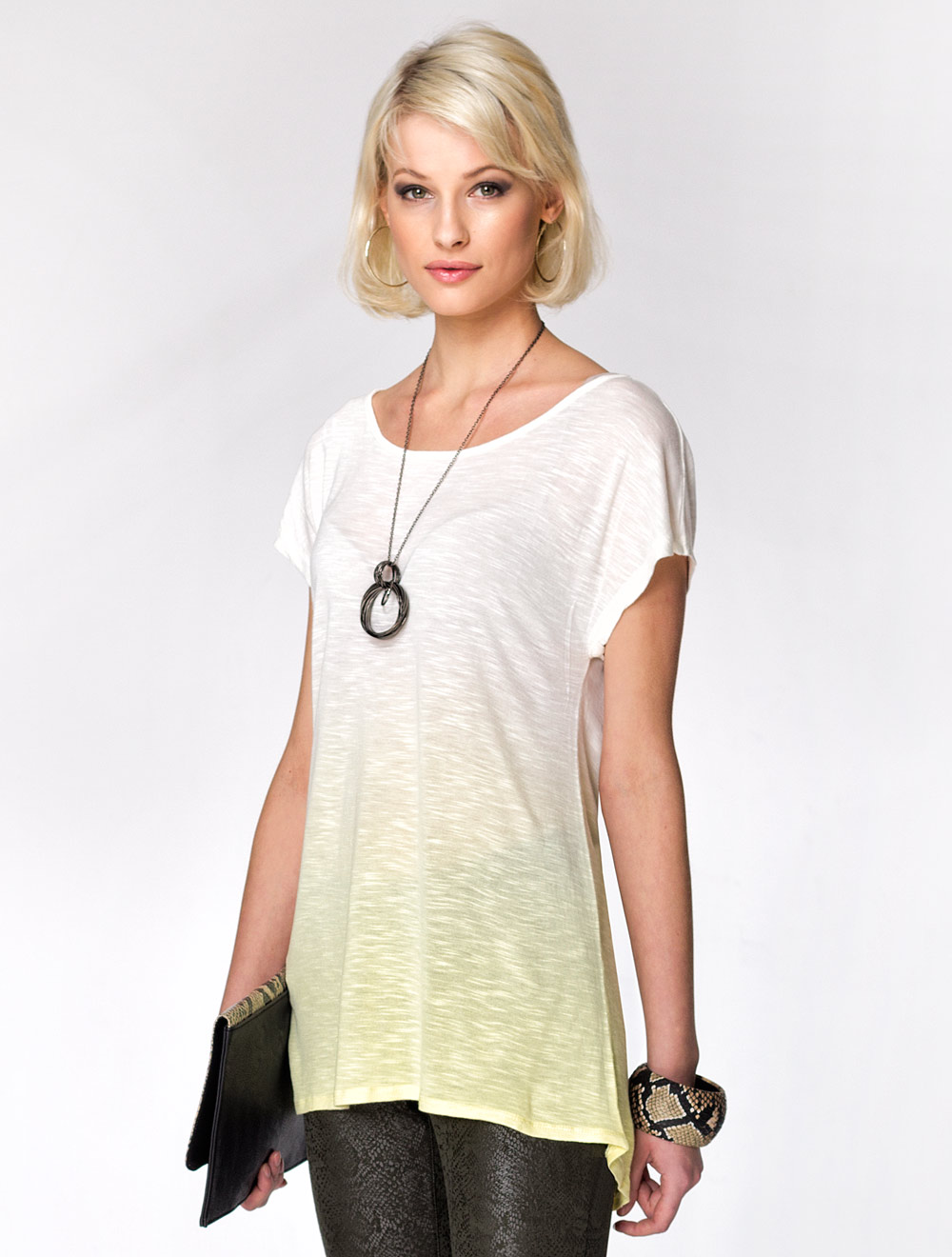 Описание: Тонкое трикотажное и полупрозрачное полотно с уплотнениями нитей в плетении.Свободный силуэт удлиненный сзади. Широкий вырез горловины и цельнокройный рукав. Главный эффект изделия в цветовом градиенте ткани.