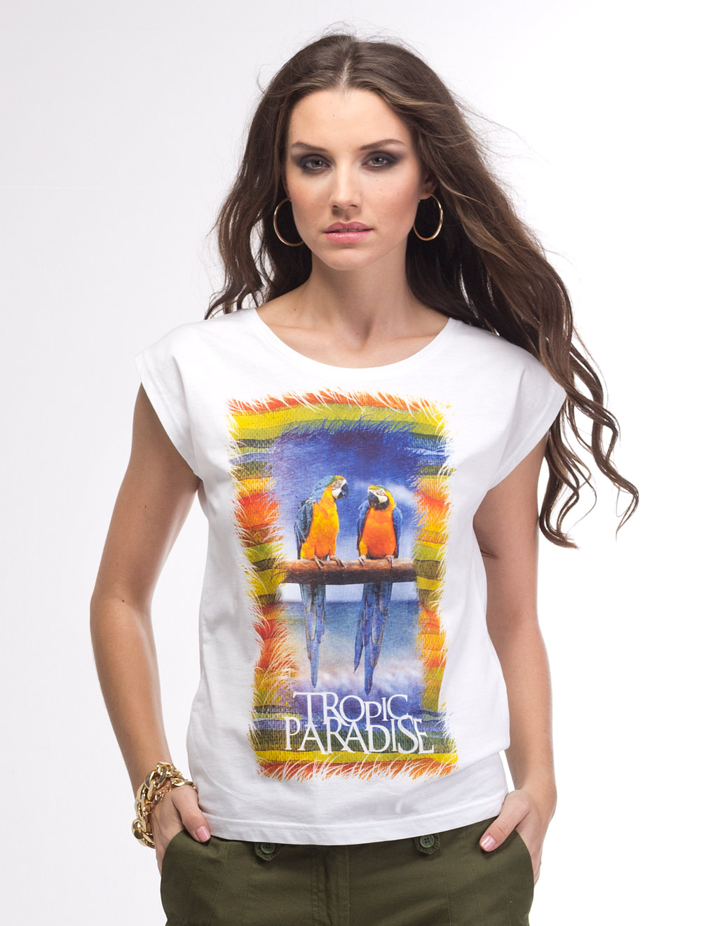 Описание: Хлопковый трикотаж средней плотности. Свободный силуэт со спущенным плечом. Перед украшен тропическим принтом.