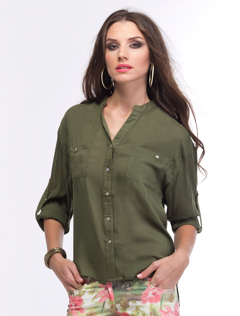 Описание: Тончайшее вискозное полотно "вуаль". Свободный силуэт классической блузки "сафари", накладные передние карманы, отвороты рукава закрепляются на паты, эффектное оформление спинки кокеткой с защипами. Пуговицы из натурального ракушечника.