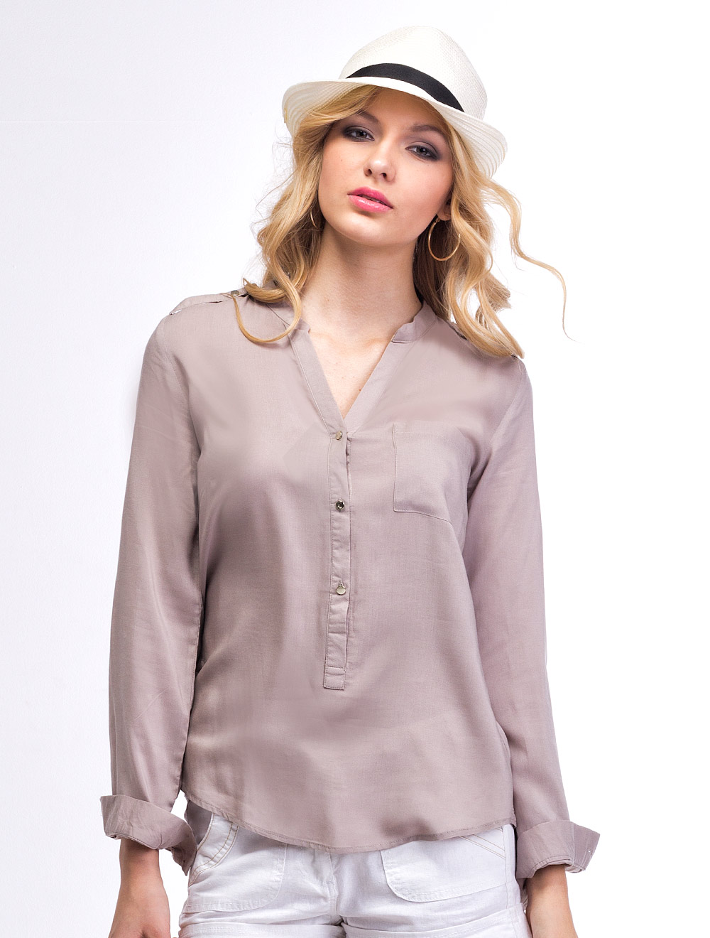 Описание: Тонкое вискозное полотно. Застежка на планку, расположенную спереди до линии талии. Плечи украшены патами-погонами, рукава на классических манжетах. Пуговицы на ножке золотистого цвета.