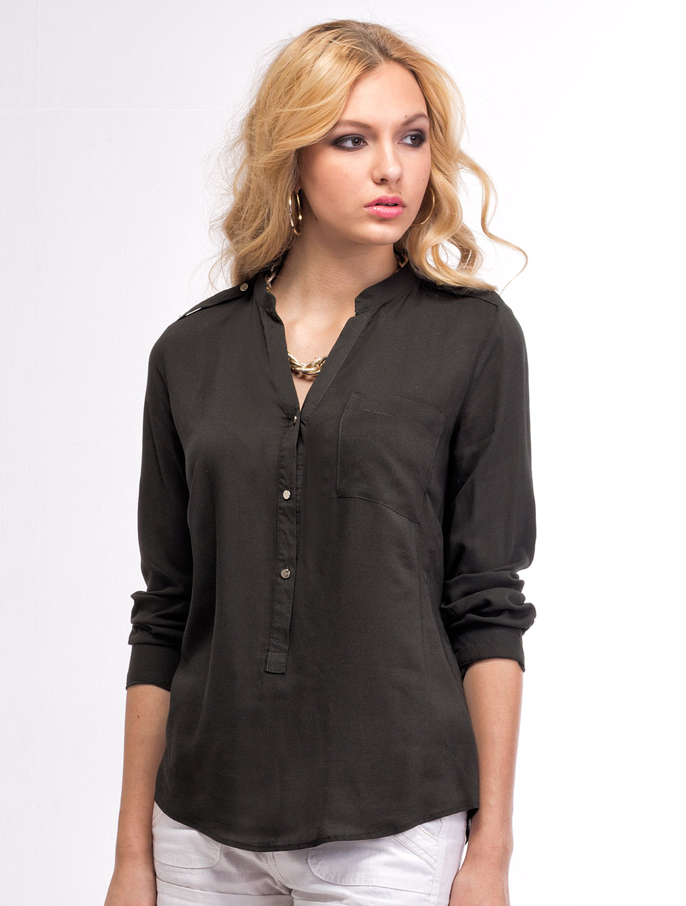 Описание: Тонкое вискозное полотно. Застежка на планку, расположенную спереди до линии талии. Плечи украшены патами-погонами, рукава на классических манжетах. Пуговицы на ножке золотистого цвета.