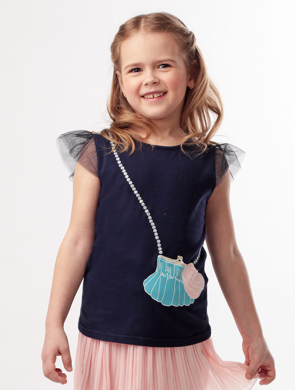 Описание: Футболка из эластичного хлопкового трикотажа. Рукава-крылышки выполнены из сетки. Принт в виде сумочки с цветком, цепочка которой выполнена из глиттера серебристого цвета.