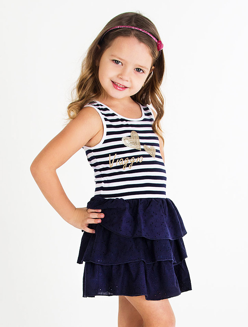 Описание: Верх платья выполнен из хлопкового трикотажа, декорирован пайетками и принтом с глиттером. Воланы из хлопковой ткани с вышивкой.