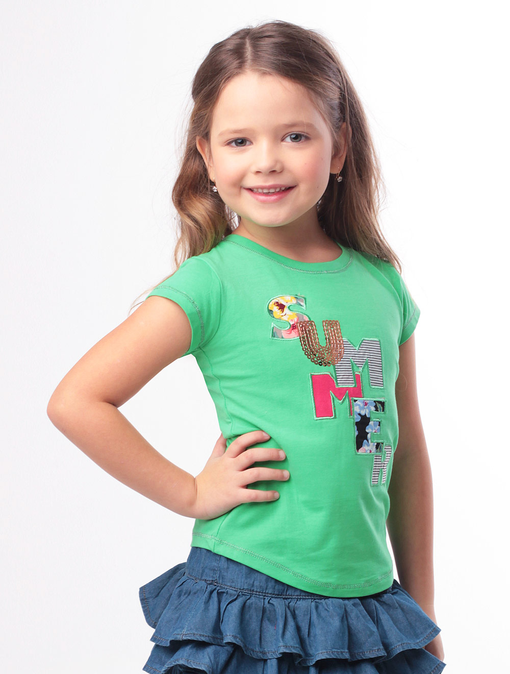 Описание: Футболка из хлопкового трикотажа с добавлением эластана. Декорирована аппликацией из принтованной ткани и пайетками.