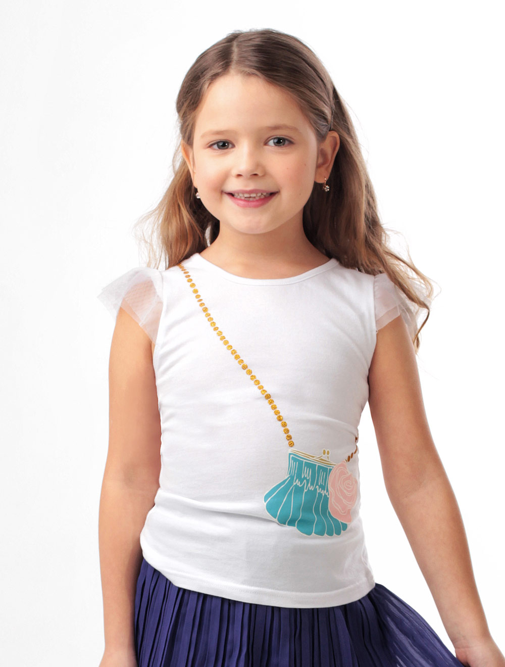 Описание: Футболка из эластичного хлопкового трикотажа. Рукава-крылышки выполнены из сетки. Принт в виде сумочки с цветком, цепочка которой выполнена из глиттера серебристого цвета.
