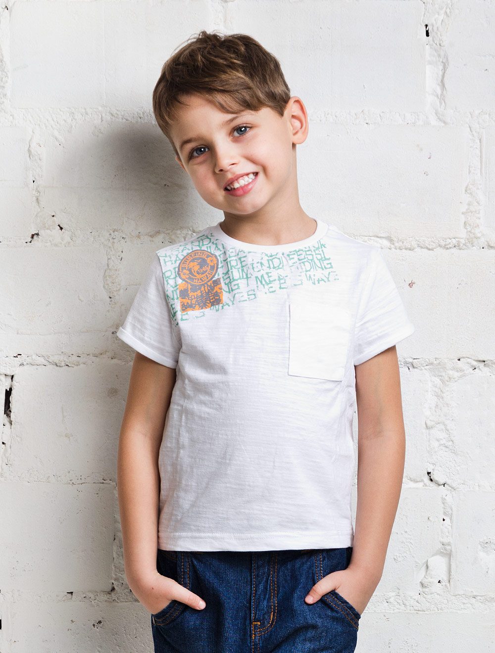 Описание: Футболка из фактурного хлопкового трикотажа с уплотнением нити в переплетении, декорированная принтом. На боку спереди небольшой карман.