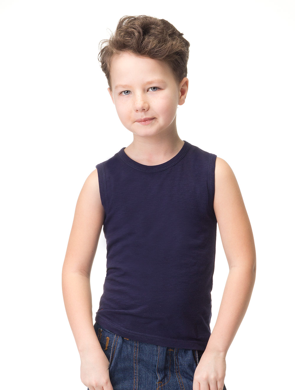 Описание: Майка из фактурного хлопкового трикотажа с уплотнением нити в переплетении. В нижнем углу изделия небольшая вышивка буква V в тон изделия.