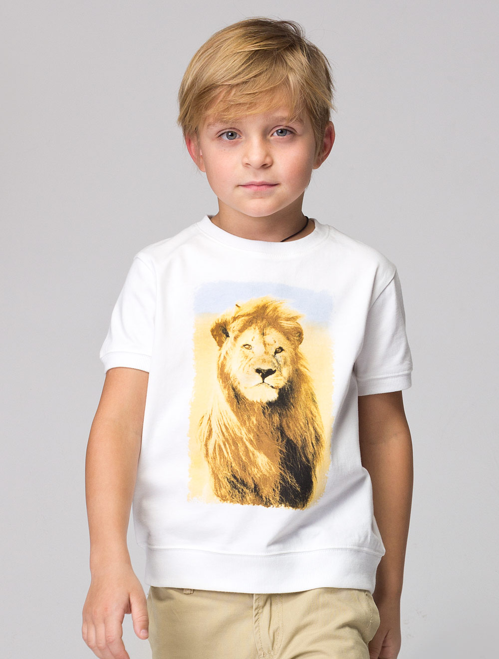 Описание: Футболка из хлопкового трикотажа, декорированная фото-принтом "лев". Низ изделия на кокетке.