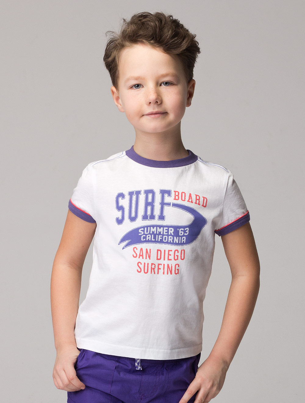Описание: Футболка с принтом на тему серфинга. Контрастная окантовка горловины и низа рукавов с коралловым кантом.
