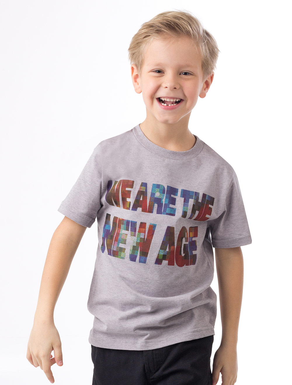 Описание: Хлопковый трикотаж цвета серый меланж. Принт в стиле увеличенной на экране фотографии и надпись "we are the new age"