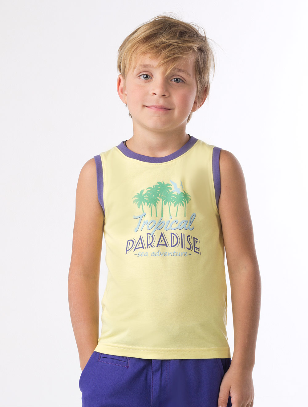 Описание: Майка с принтом на тропическую тему. Контрастная окантовка горловины и пройм