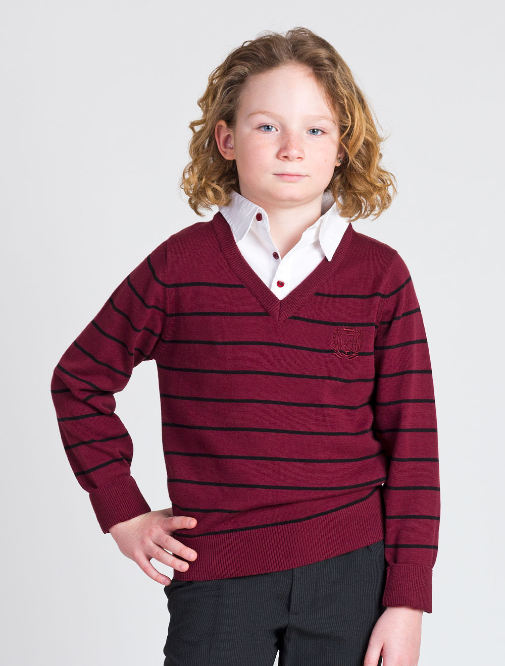 Описание: Основа - вязка средней плотности, воротник выполнен из рубашечной ткани, спереди на груди вышита эмблема.