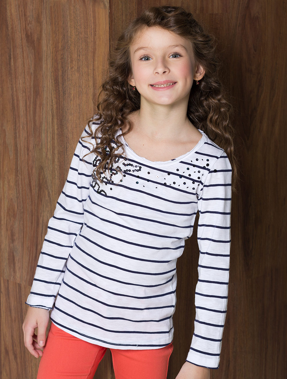 Описание: Футболка для девочки с широкой горловиной, расшита пайетками на груди.