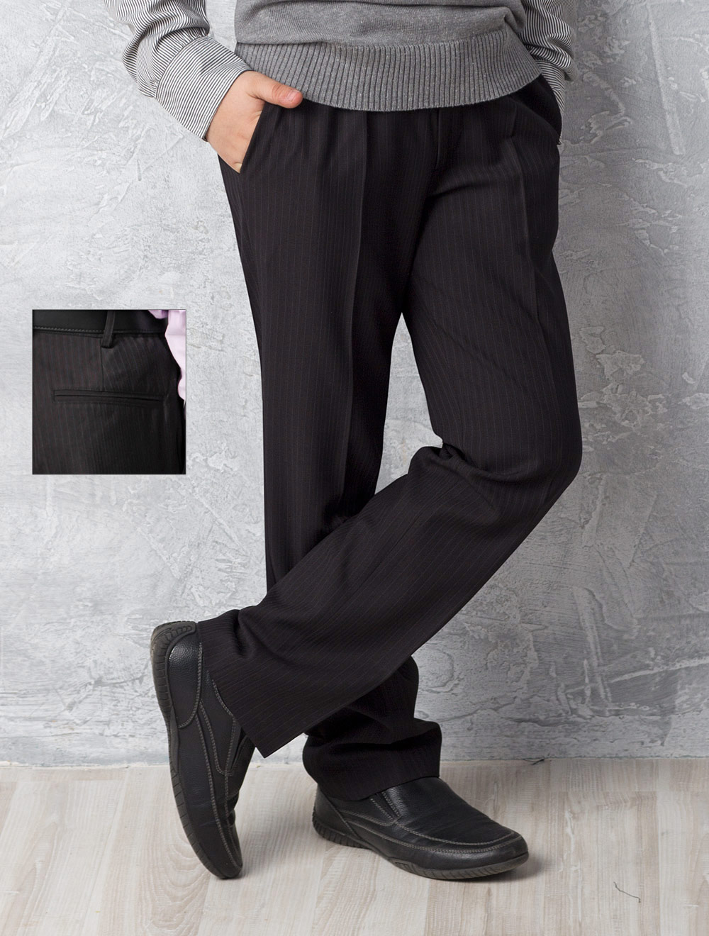 Описание: Классические брюки со стрелками для мальчика. На правой задней половинке обработан карман в рамку. На талии по бокам для лучшей посадки вставлены резинки. Мешковина заднего кармана окантована отделочной тканью.