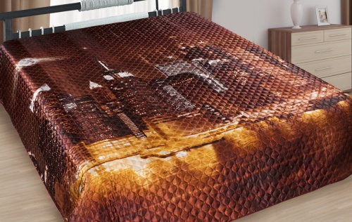 Покрывала всех коллекций изготовлены способом ультрастеп (термостёжка), представляет собой полотно шириной 220 см (ткань с 2х сторон, в середине синтепон 80гр/м2).Ткань искусственный шелк, плотность 107 гр/м2, активное (стойкое) крашение, не линяет.Верх покрывала - набивной рисунок в виде панно, 3D - объемное изображение, низ - однотонная ткань в тон. Края обработаны шелковой бейкой в тон.