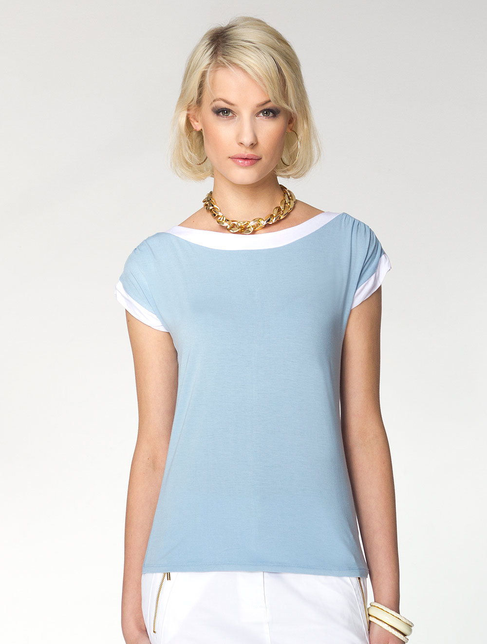Описание: Эластичный висконый трикотаж с контрастными окантовками манжет и горловины, на рукавах белые паты с золотистыми пуговками.