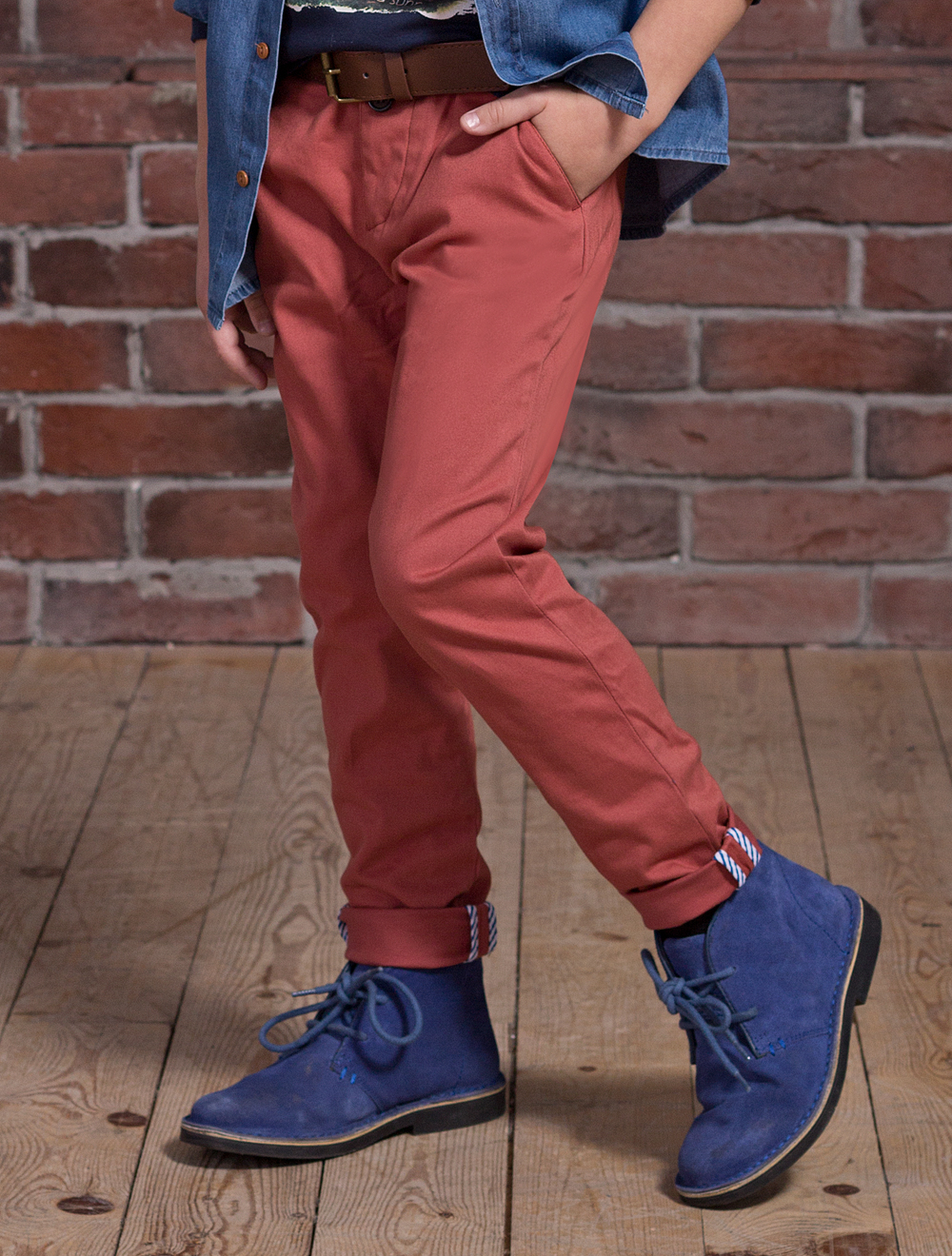 Описание: Брюки с манжетами-отворотами по низу. Застежка-гульфик на пуговицы. Талия регулируется внутренней резинкой и пуговицей. Продается в комплекте с ремнем.