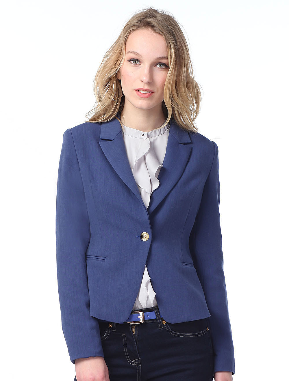 Описание: Жакет классического покроя из мякгой поливискозы, Cиний цвет с эффектом легкого меланжа и пуговица под натуральный орех - придают жакету эффект стиля casual. Жакет удобно сочетать как в классических комплектах, так и с денимом.