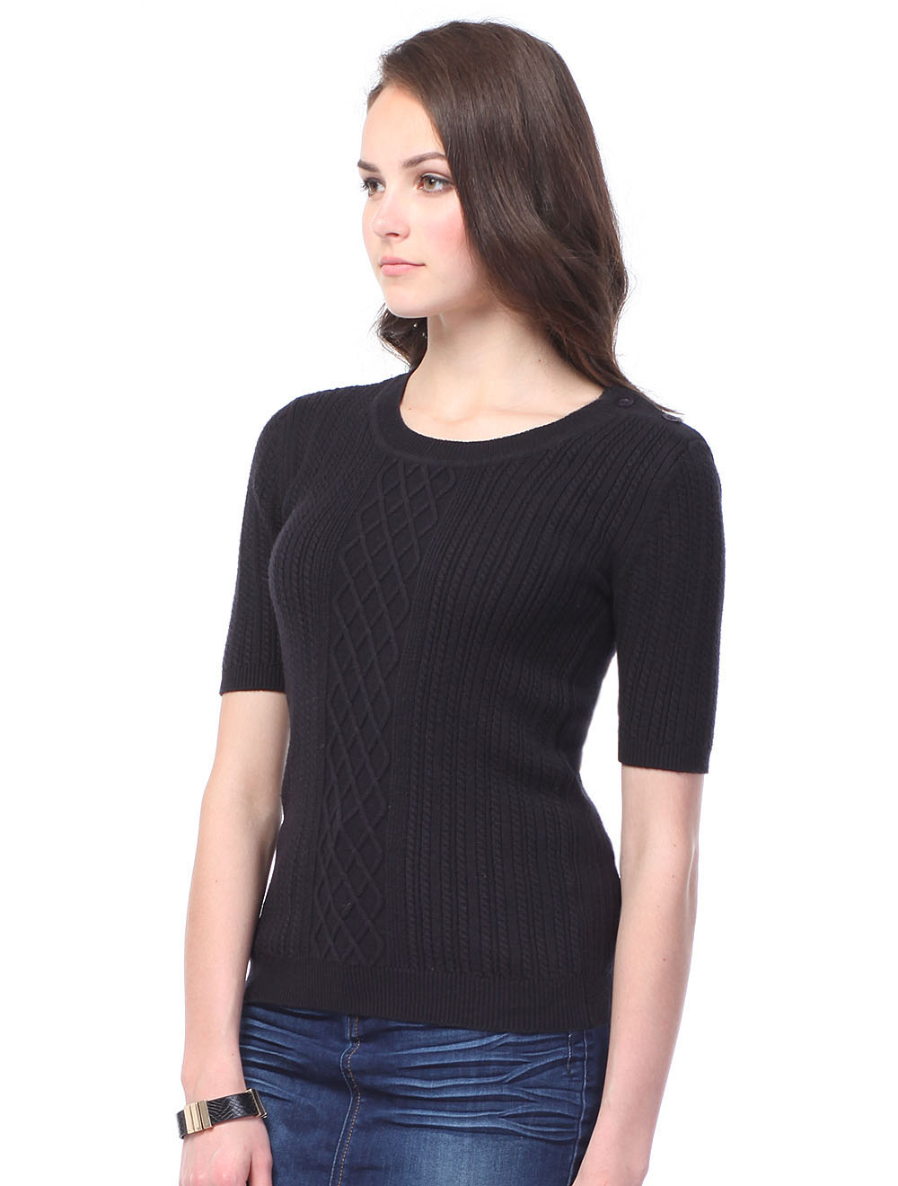 Описание: Вязка средней плотности с фактурным узором спереди. Мягкости изделию придает наличие кашемира в составе пряжи. На одном плече застежка на пуговицы.