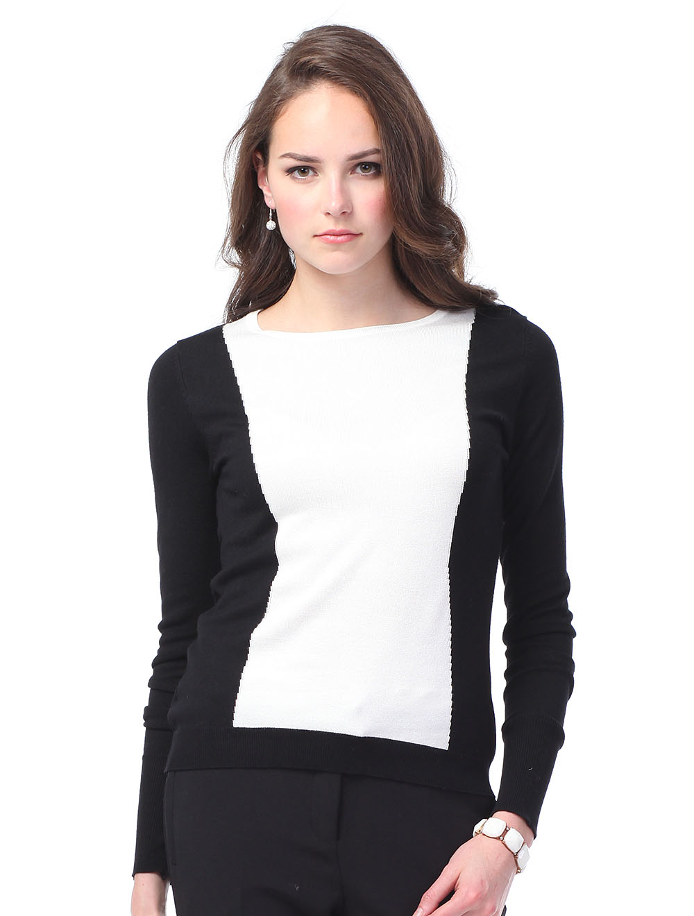 Описание: Тонкая вискозная вязка. Перед вывязан графичной приталивающей вставкой белого цвета. Спинка черного цвета.