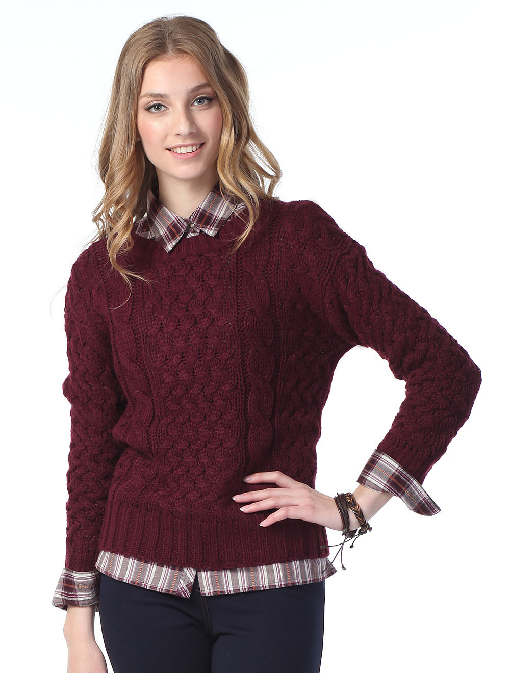 Описание: Свободный силуэт со спущенным плечом, крупная узорная вязка из толстой нити.