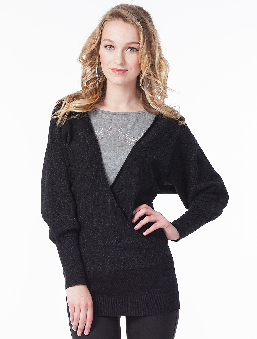 Описание: Джемпер с эффектом запаха. В пряже присутствует люрекс, что создает эффект мерцания.