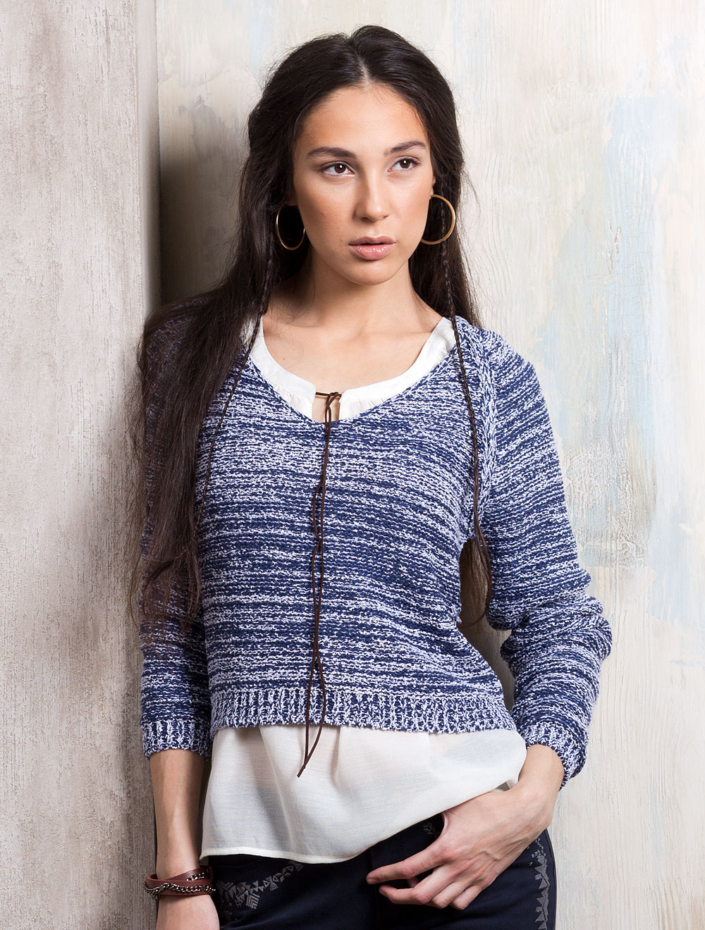 Описание: Крупная двуцветная вязка меланж из буклированных нитей. Укороченный перед, спинка с закругленным нижним срезом - по центру украшена вертикальной полосой 2 см лицевой вязки.