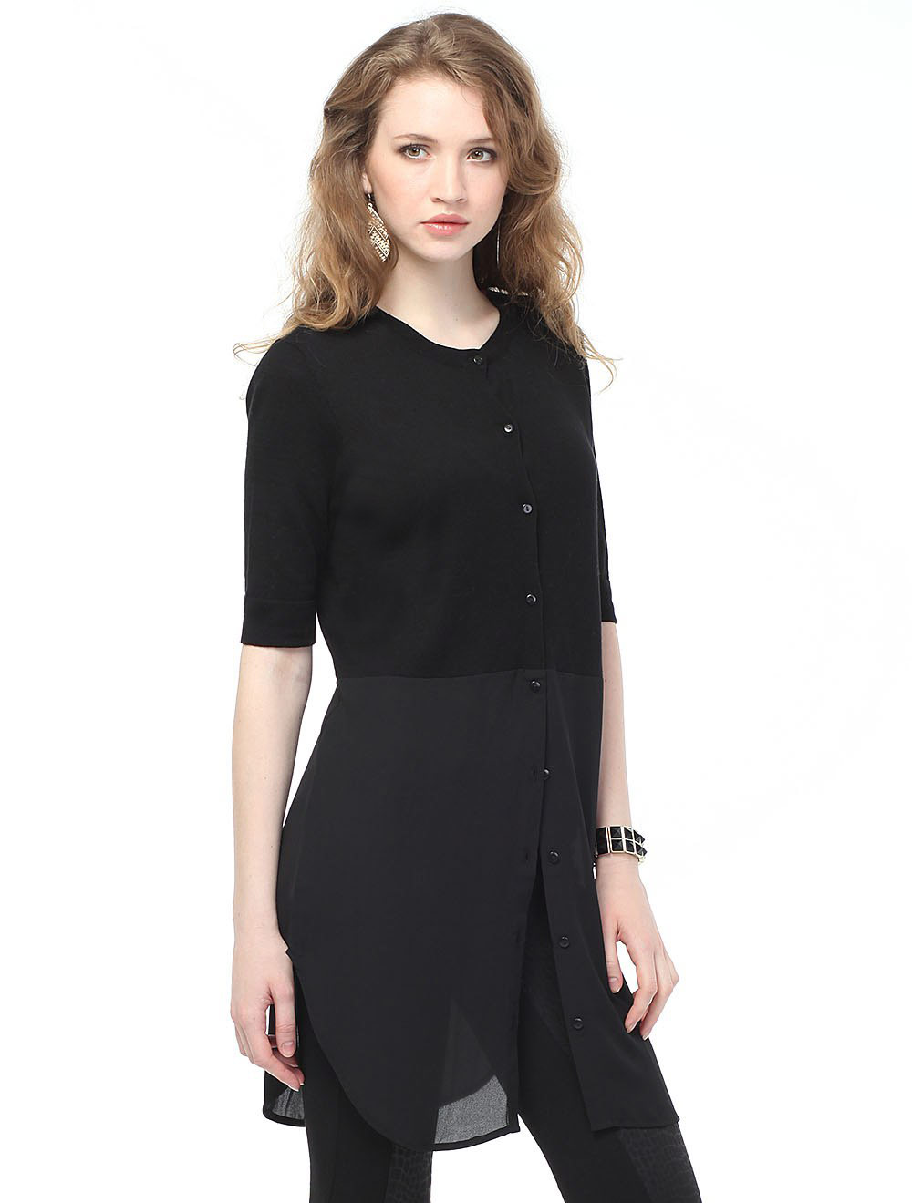 Описание: Верхняя часть до линии талии выполнена тончайшей хлопковой вязкой. Нижняя часть из летящей ткани с закругленными нижними срезами. Изделие можно носить, как кардиган или как супер-актуальное платье-рубашку.