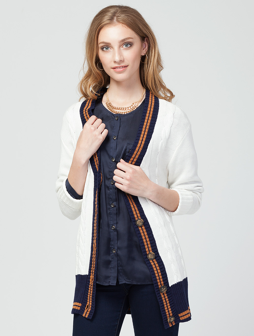 Описание: Крупная фактурная вязка, спереди украшена косами. Полуприлегающий силуэт в стиле 80-х. - более свободный в верхней части, спущенная пройма и широкий рукав на узком длинном манжете. Крупные пуговицы "под натуральный орех". Низ на широкой резинке.