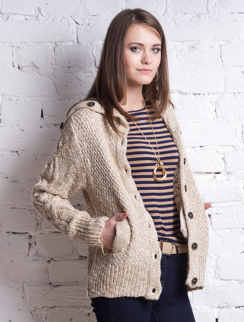 Описание: Крупная вязка из мягкой и теплой пряжи меланж. Рукава вывязаны с узором косы. Застежка на крупные коричневые пуговицы. Широкий воротник связан резинкой застегивается до верху. Имеются карманы на листочках.