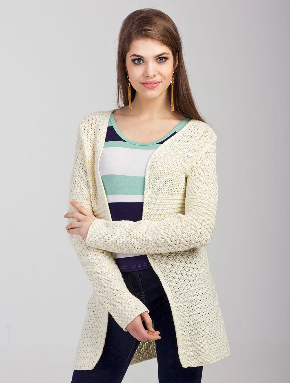 Описание: Жакет выполнен из плотной хлопковой пряжи. Разнообразие фактур вязки подчеркивает силуэтные линии. Жакет удлиненный, без застежки.