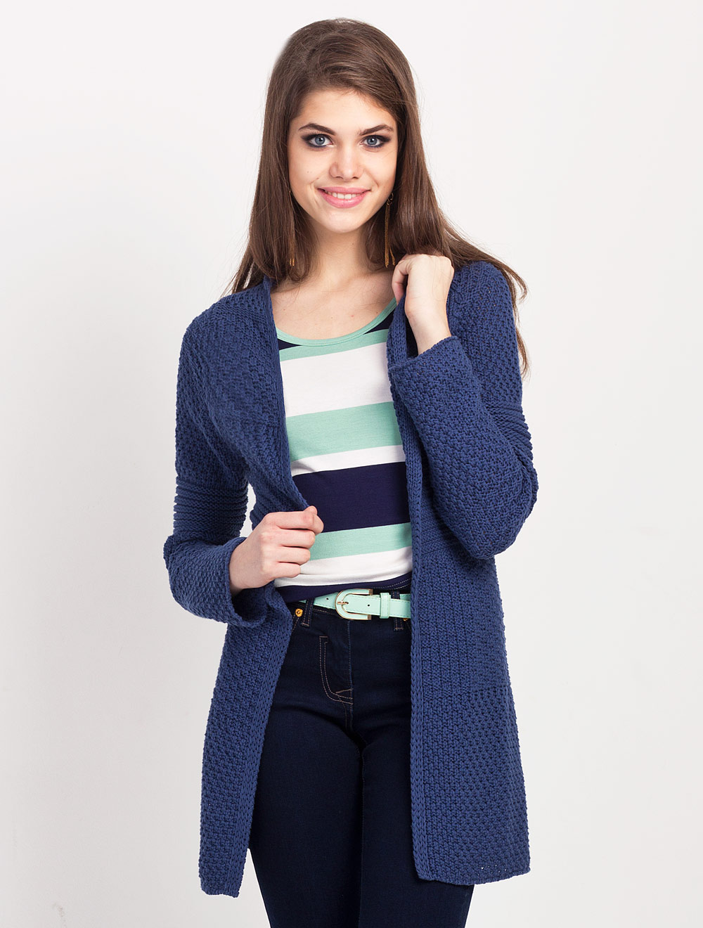 Описание: Жакет выполнен из плотной хлопковой пряжи. Разнообразие фактур вязки подчеркивает силуэтные линии. Жакет удлиненный, без застежки.