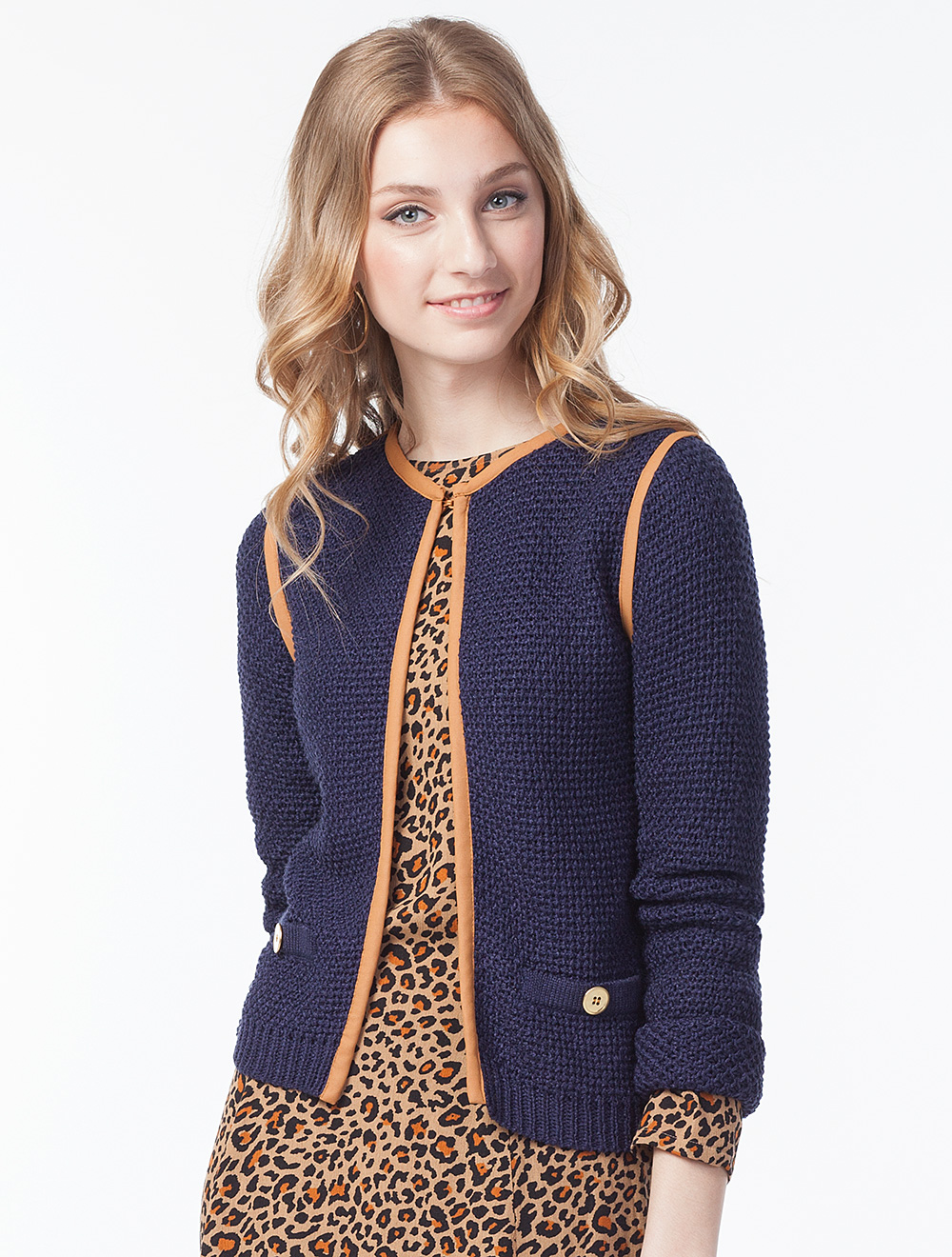 Описание: Крупная фактурная вязка, имитирующая стиль тканей "Шанель". Окантовки пройм, горловины, плечевых швов и бортов выполнены из неэластичного полиэстера контрастного цвета - обеспечивают жакету формоустойчивость.