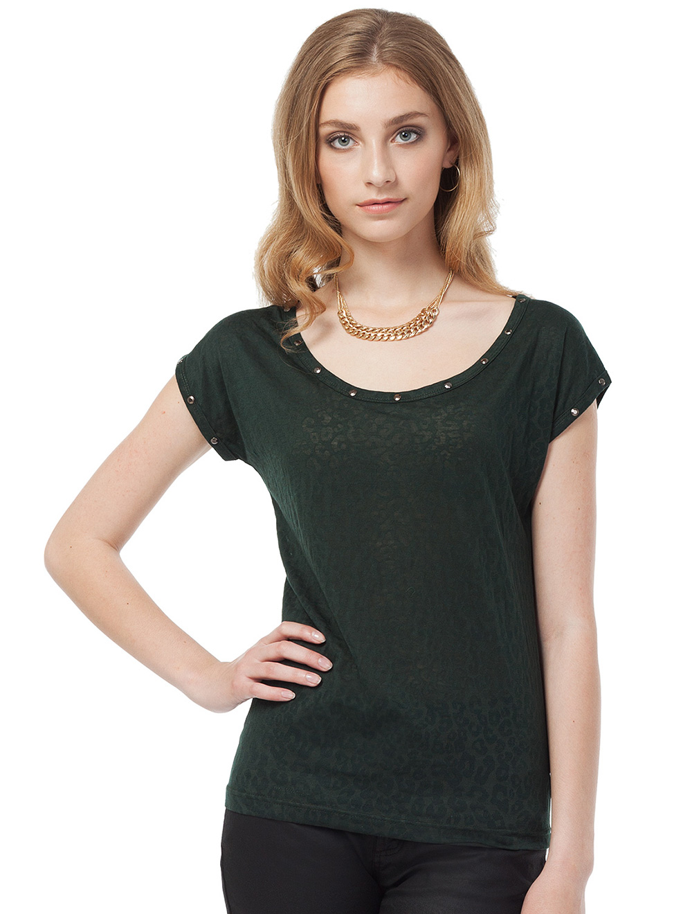 Описание: Тончайшее трикотажное полотно с полупрозрачным рисунком под шкуру леопарда. Горловина и низ цельнокройных рукавов окантованы и украшены металлическими заклепками.