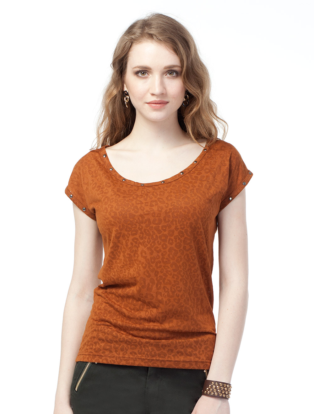 Описание: Тончайшее трикотажное полотно с полупрозрачным рисунком под шкуру леопарда. Горловина и низ цельнокройных рукавов окантованы и украшены металлическими заклепками.