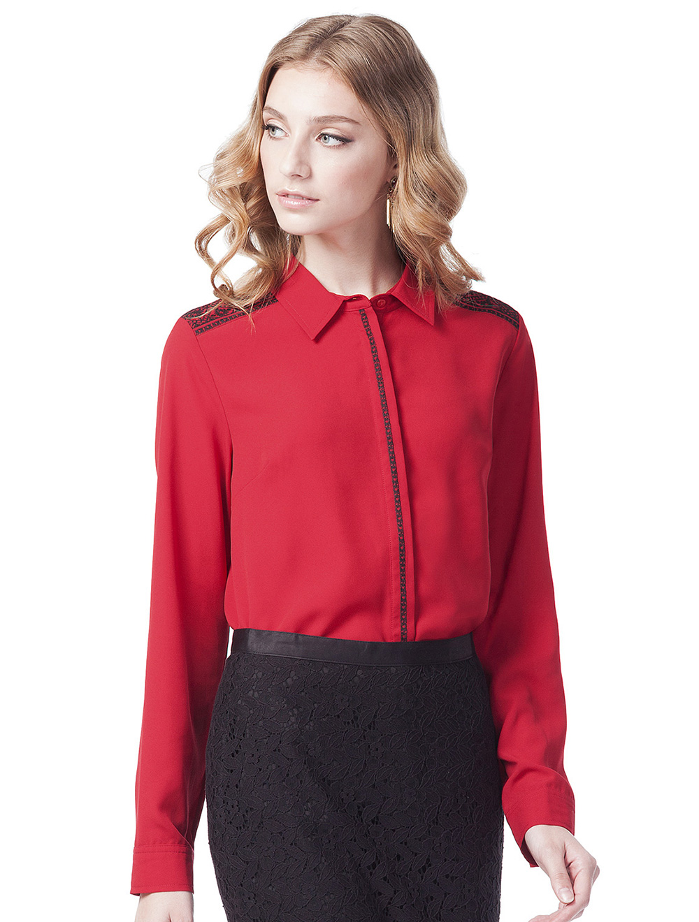 Описание: Плотный матовый полиэстер. Удлиненная спинка со скругленной линией низа. Потайная застежка на пуговицы. Передняя планка и плечи украшены черной вышивкой с мелким этническим узором.
