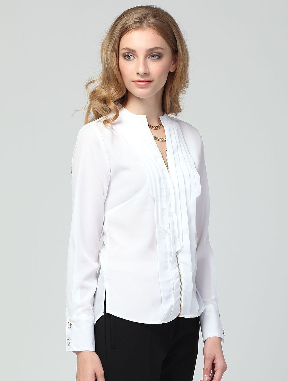 Описание: Полиэстер матовый, средней плотности. На передней части заложено несколько рядов застроченных складок. Застежка на металлическую молнию. Воротник - узкая стойка. Крупные декоративные пуговицы на манжетах.