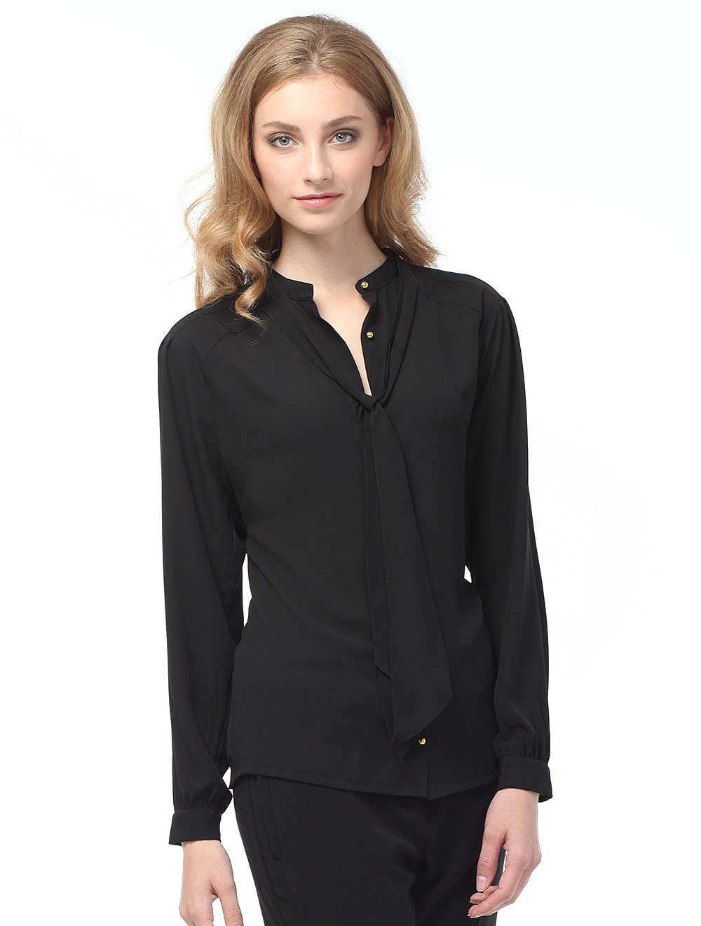 Описание: Плотный и драпируемый матовый полиэстер. Рукав-реглан на плечах застрочен в несколько защипов, которые раскрываются на окате рукава, делая его широким от плеча до манжеты. Ворот стойка украшен съемной завязкой, которая крепится в шлевках. Возможно создать как романтичный образ с бантом, так и строгий классический вообще без завязки.