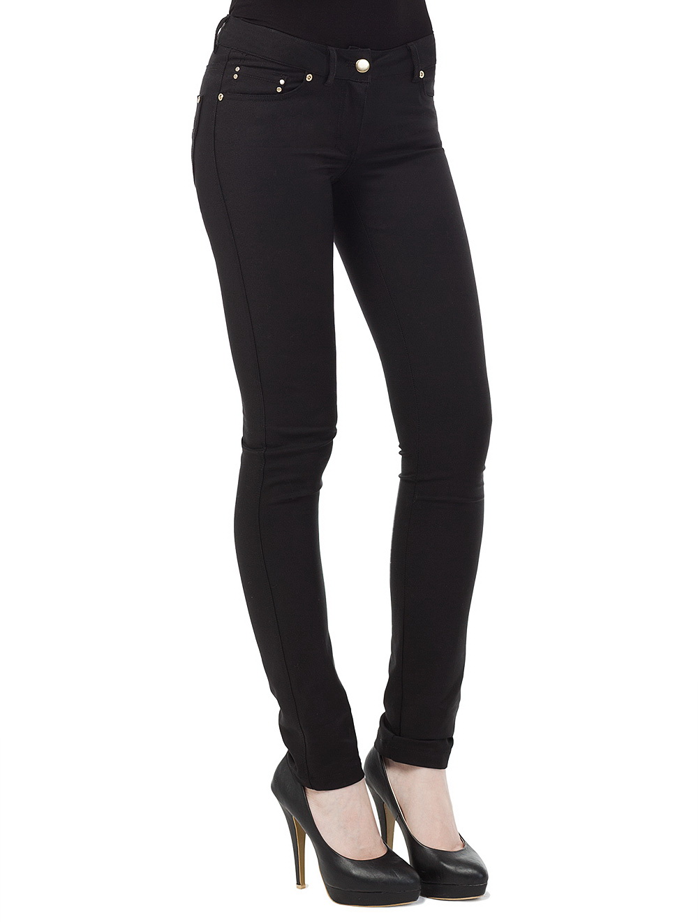 Описание: Брюки джинсового покроя с декоративными накладными карманами сзади. Выполнены из очень плотной и эластичной ткани. Не мнутся и прекрасно держат форму, подтягивают фигуру. Украшены металлическими заклепками на карманах.