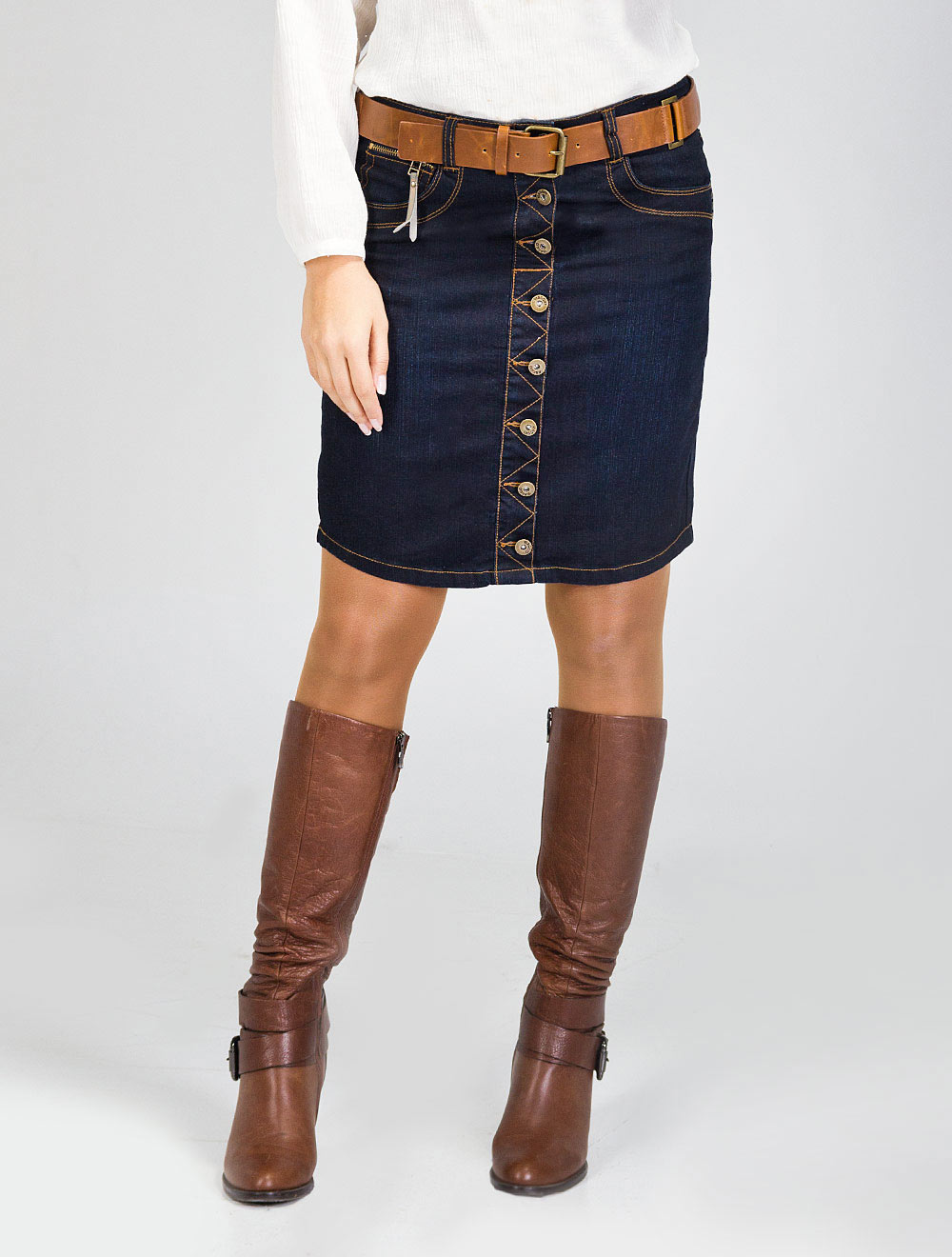 Описание: Выполнена из плотной эластичной джинсовой ткани. Изогнутая линия низа, удлиненная спереди и сзади. Застежка-"обманка" на металлические болты. Карман спереди украшен металлической молнией с кожаной подвеской. В больших размерах длина по колено.