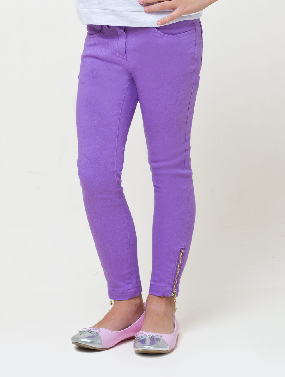 Описание: Узкие брюки для девочки из эластичного хлопка. Ширина талии регулируется внутренней резинкой. Разрезы по бокам обработаны молнией.