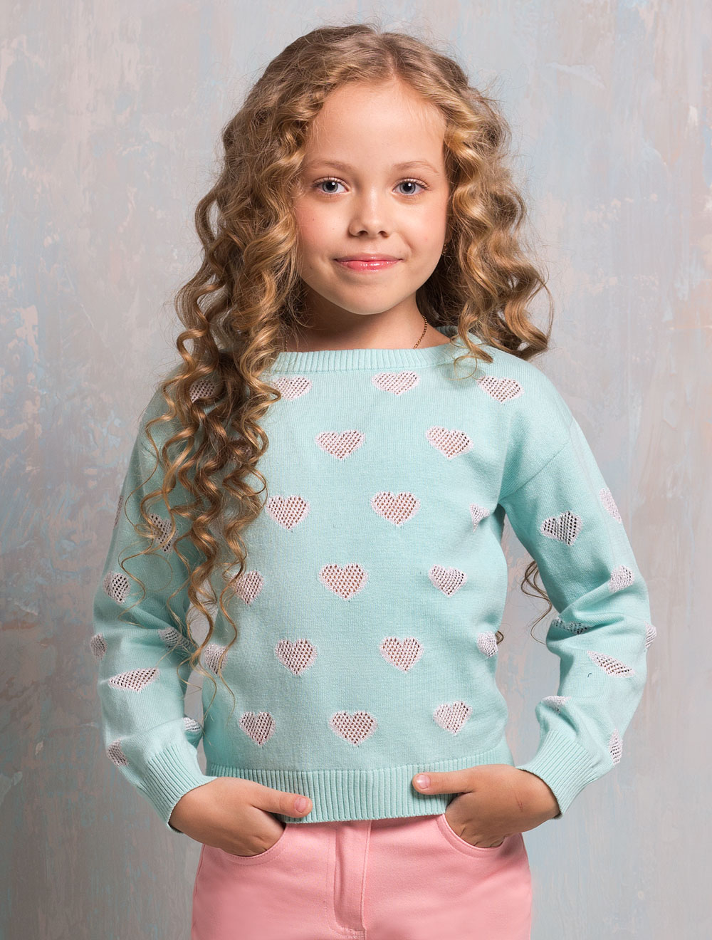 Описание: Джемпер для девочки с рисунком "сердца". Сердечки выполнены ажурной вязкой хлопковой нитью с люрексом. Состав 100% хлопок.