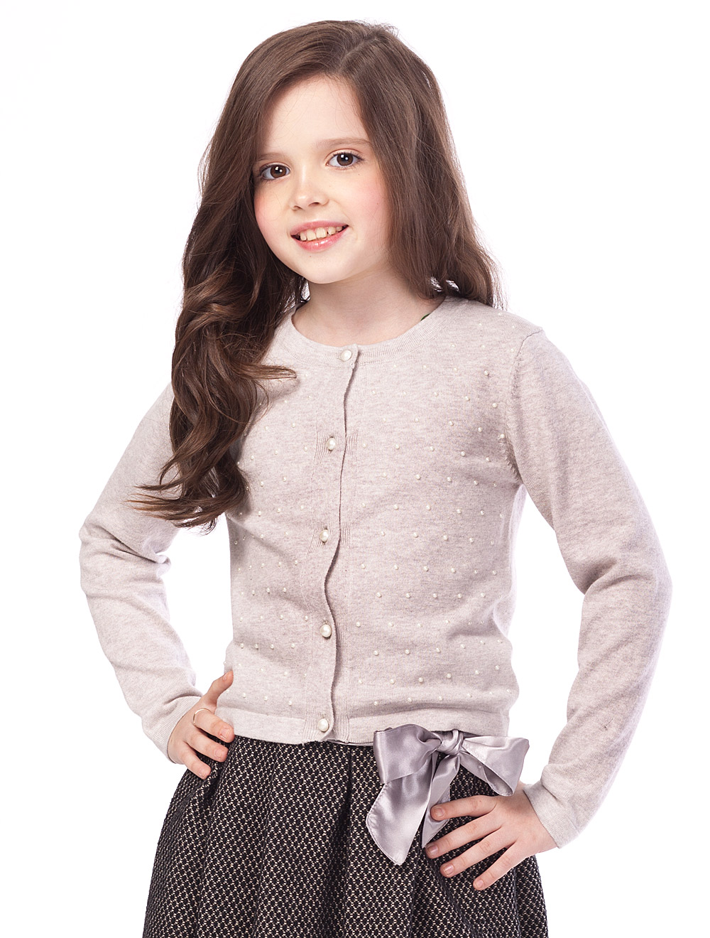 Описание: Жакет для девочки умеренного объема. Передняя часть полностью расшита жемчужными полусферами. Застежка вдоль планки на жемчужные пуговицы.