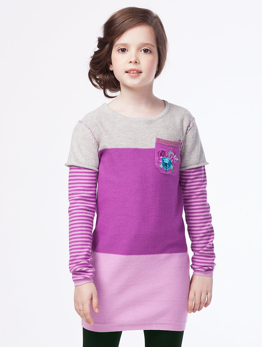 Описание: Вязаное платье из мягкого хлопка. Окантовка горловины с добавлением люрекса. Карман декорирован вышивкой.