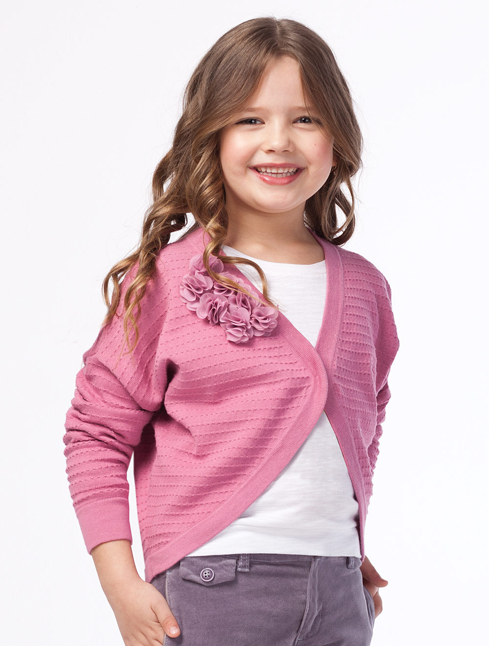 Описание: Жакет из хлопковой пряжи ажурной вязки, декорированный цветами из шифона. Спереди застежка на кнопку.