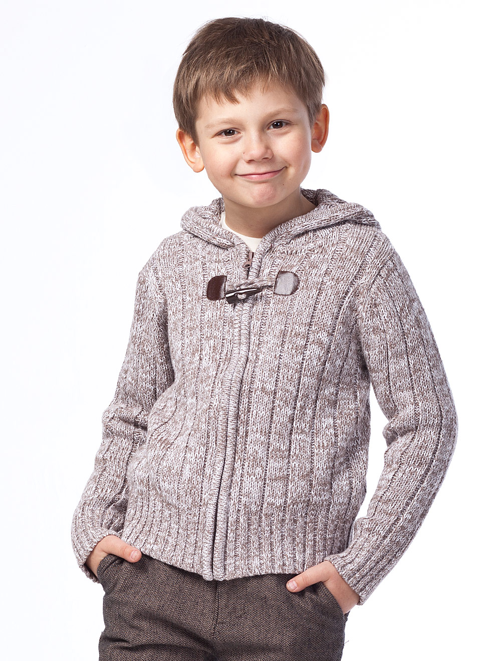 Описание: Вязаный жакет с декоративной застежкой и капюшоном.