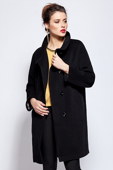 Элегантное современное пальто на подкладке. Удобная модель актульного свободного силуэта "кокон", без пояса, с застежкой на яркие пуговицы и объемным воротником.