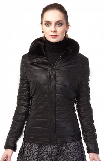 Утеплённая синтепоном приталенная куртка из мягкой искусственной кожи с декоративными отстрочками, застёжкой на молнии и кнопках. Воротник с внутренней стороны декорирован искусственным мехом, имеет удобную застёжку на кнопке.